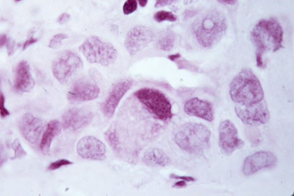 Niche self-renewal daughter cell (see low power: 1459): abandoned niche: may be remains of self renewal cell) Niche with single self-renewal daughter cell. (Papillary carcinoma of urinary bladder) |