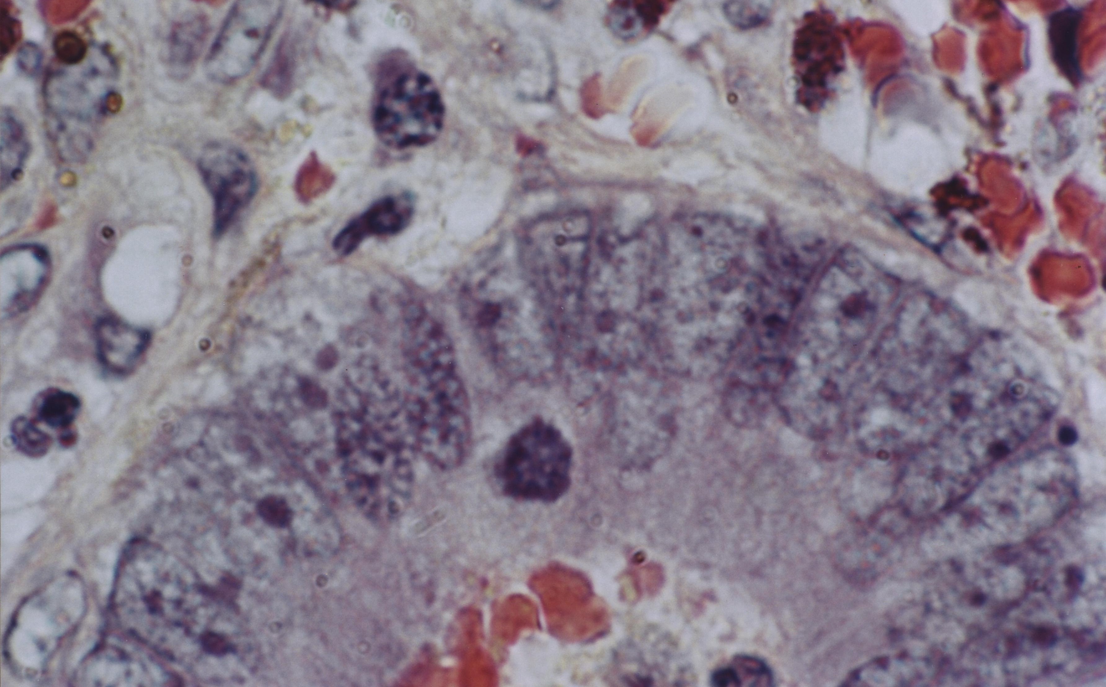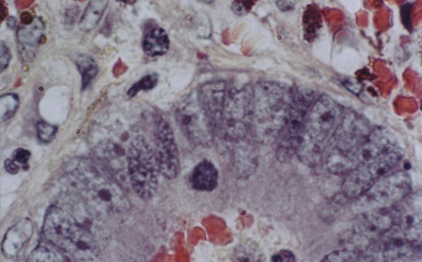 (see low power AACR_Scan18-crop-circle.jpg) Migrating stem cell: Cell consists of uniform-sized spheres. (Adenocarcinoma colon)
