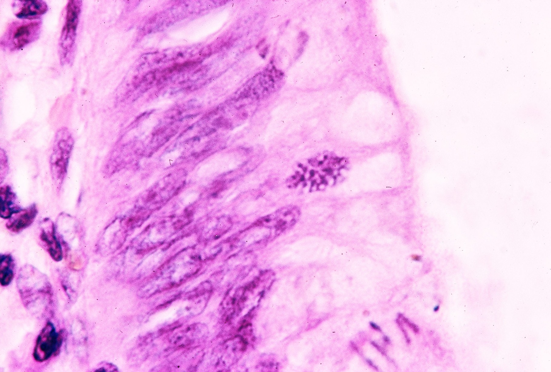 (see low power DRNEPT2-R01-026-circle.Jpg) Migrating stem cell : Cell consists of uniform-sized spheres. (Benign area adjacent adenocarcinoma colon)