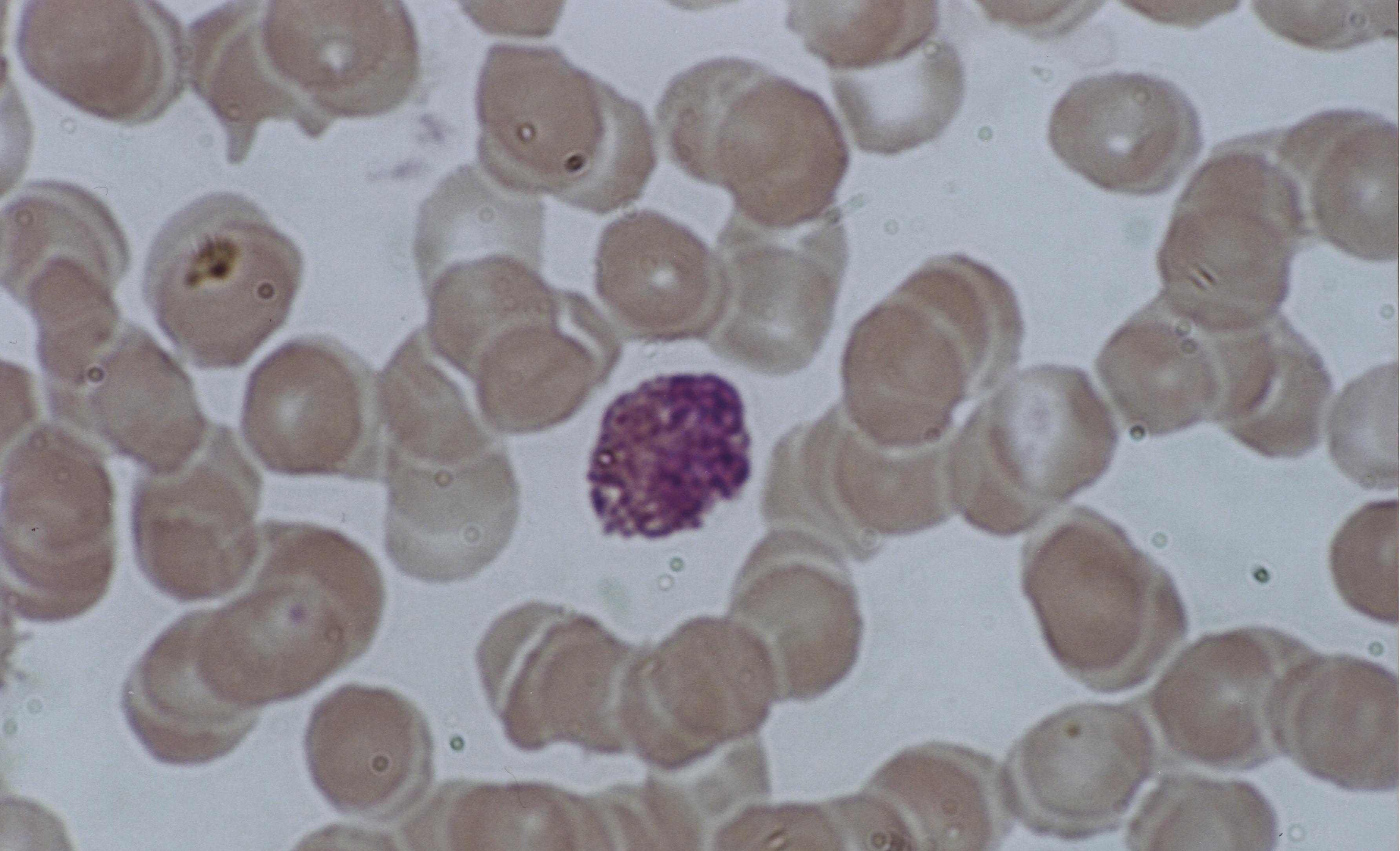 Migrating stem/progenitor cell with rugged border. (Blood smear from patient with breast cancer)