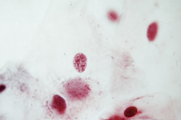 Prominent spheres with uniform diameters. (Patient with recurrent mucus cyst adenocarcinoma) see also: DRNEPT3-R01-004.jpg