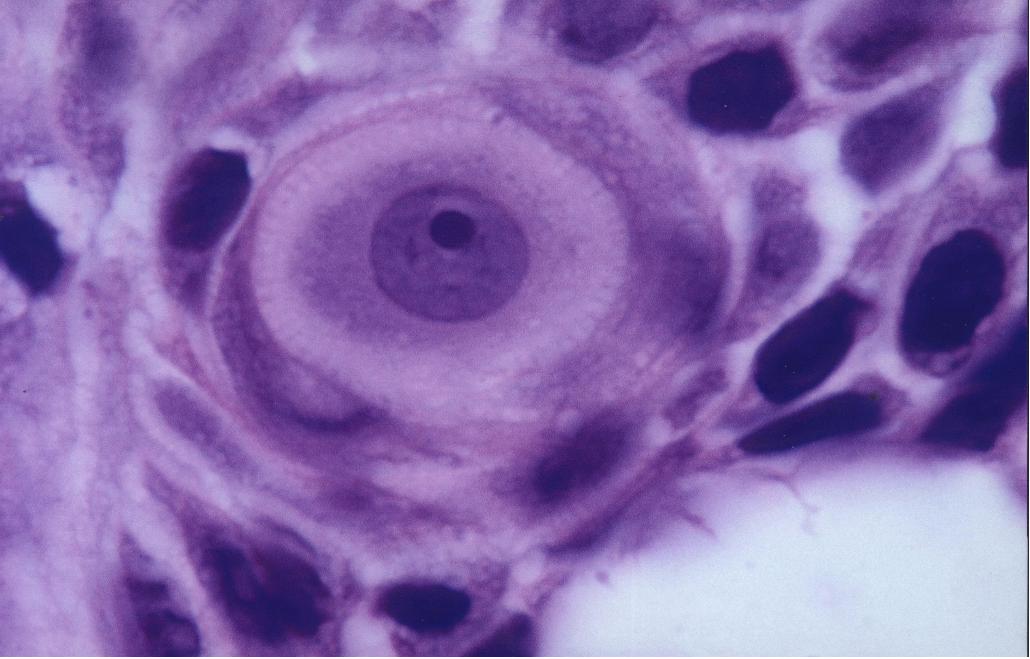 Stem cell niche halo (see also low power: AACR_Scan05.jpg , DSC_1475.jpg) Stem cell niche: Cell in quiescent state; halo formation between inner and outer membrane; niche surrounded by closely attached support cells. (High-grade intraepithelial neoplasia) |