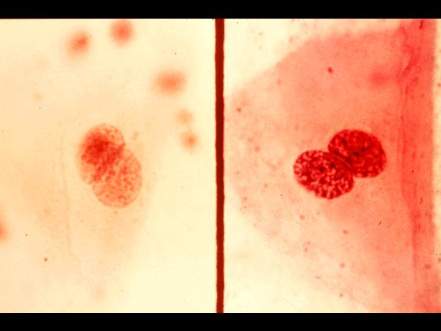 Right - Binucleated buccal cells with hyperchromatic cribriform structure - leukemia