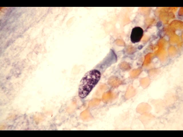 Cilliated bronchial cell with hyperchromatic chromocenters and chromatin bands (less frequently encountered)